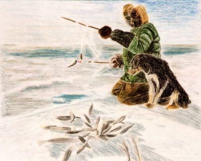 "Fischender Eskimo mit Hund"